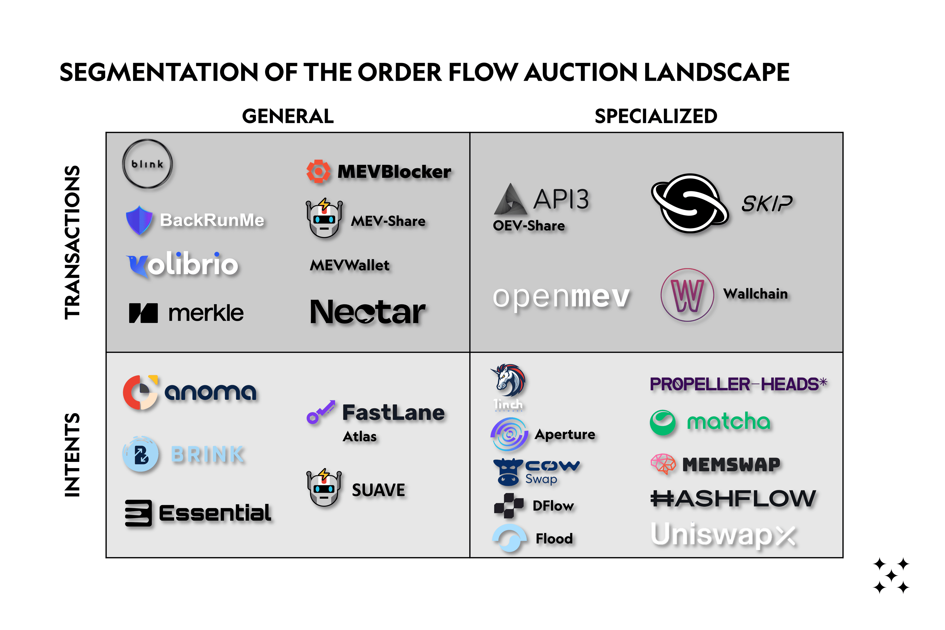 We identified over 27 different OFA solutions, many of which have collected significant funding. The design space for these solutions is wide and teams have to make trade-offs between user welfare maximization, decentralization, and trustlessness, among others. We identify two main axes of differentiation between deployed/announced solutions. OFAs can be intent or transaction-based, and they can be specialized or general.